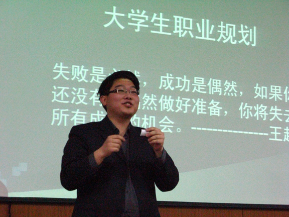 王超老师以幽默的游戏互动开场,形象的表述我们工作仅仅占据生命的很少时间,让同学们明白了规划职业生涯的重要性。首先,他向同学们介绍了大学生如何做好职业规划这一问题,然后引出了同大家共享的几个问题,主要包括职业生涯与目标、我的职业生涯分析、职业生涯与心态以及职业生涯与企业等方面的问题。其次,在讲到人生的目标时,他举了拿破仑与张无忌的例子,指出目标决定一个人成功的高度,确立明确的目标,在以后的职业生涯中占据着非常重要的地位。第三,他重点指出要有客观的自我分析和职业分析能力,要有合理的知识结构和必要的实践能力、社交技能和求职技巧以及健康的人格和良好的习惯。第四,在讲到职业生涯与心态时,他引用一条狗与另一条狗的故事,分析角度与心态的不同导致的不同结果,告诉同学们成功之道=知识+心态+技巧+习惯,要求同学们要把握人生的机会。最后,王超老师为发散学生思维,增强学生思考创新能力进行现场游戏互动,在现场活跃的气氛中讲座圆满结束。
