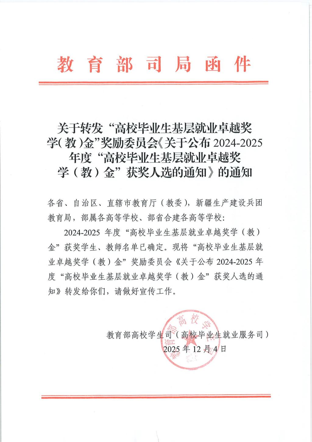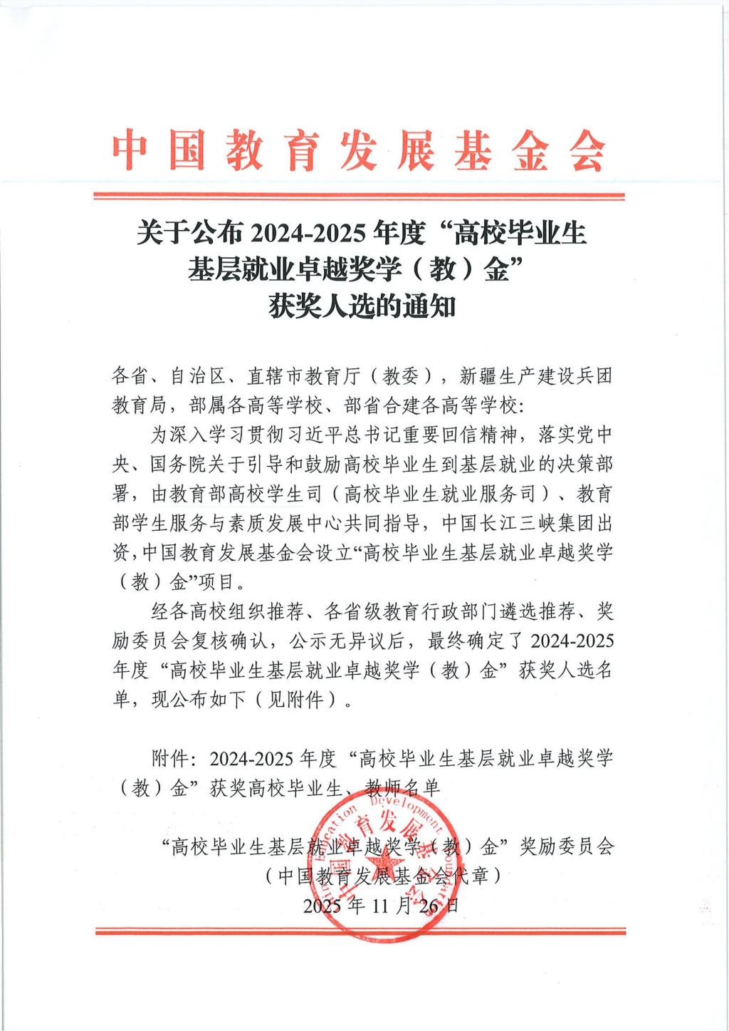 “高校毕业生基层就业卓越奖学(教)金”由教育部高校学生司(高校毕业生就业服务司)、教育部学生服务与素质发展中心指导,中国长江三峡集团出资,中国教育发展基金会设立。该奖项旨在深入贯彻落实习近平总书记重要回信精神,积极响应国家鼓励高校毕业生到基层就业的号召,表彰赴基层就业表现突出的毕业生及相关教师。本年度全国共有418名优秀毕业生和58名优秀教师获此殊荣。