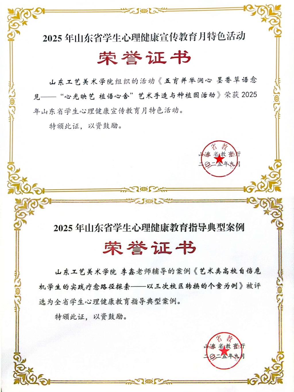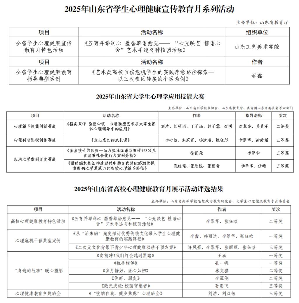 在山东省教育厅举办的心理健康宣传教育月活动中,学校报送的《五育并举润心墨香草语愈见——“心光映艺 植语心舍”艺术手造与种植园活动》获评全省心理健康宣传教育月特色活动,工业设计学院李鑫撰写的《艺术类高校自伤危机学生的实践疗愈路径探索——以三次校区转换的个案为例》获评全省学生心理健康教育指导典型案例。