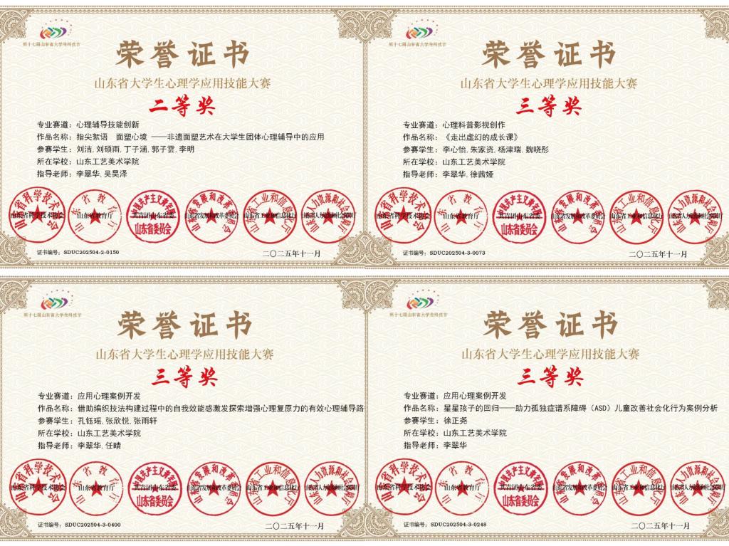 山东省大学生心理学应用技能大赛由山东省科学技术协会、山东省教育厅等六部门联合主办,据悉初赛共收到省内外近140所院校的2704项参赛作品,参赛选手13000余人,最终246项作品入围决赛角逐一、二等奖。在此次比赛中,学校获评二等奖1项,三等奖3项。