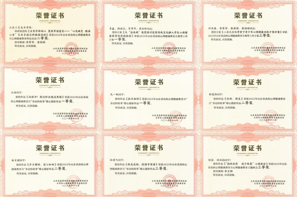 近日,山东省教育厅、山东省科学技术协会、山东省大学生心理健康教育专业委员会等部门分别公布了2025年山东省心理健康系列活动评选结果。学校荣获全省心理健康宣传教育月特色活动1项、典型案例1项、一等奖3项、二等奖4项、三等奖6项。此次获奖作品覆盖多个学院师生创作,不同维度展现了学校在大学生心理健康教育领域的积极探索与实践成果。