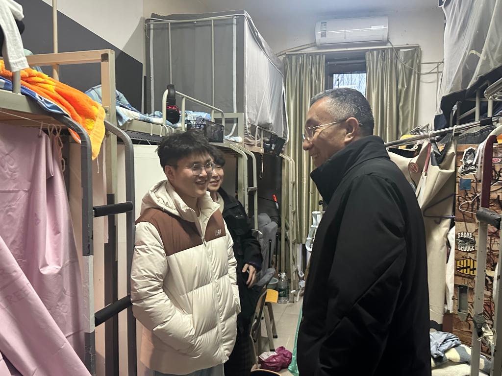 韩世春细致查看了学生公寓基础设施、环境卫生及消防安全设备配置情况。在学生宿舍,与刚刚返校的同学们亲切交谈,详细询问大家的假期生活、返校适应情况及新学期的学业规划,并叮嘱同学们要尽快调整状态,以饱满的热情投入到新学期的学习生活中。他强调,学生宿舍是学生在校期间学习生活的重要场所,学校始终坚持以生为本,不断优化服务保障,全力营造一个安全、整洁、舒适的居住环境,切实提升学生的获得感与幸福感,让同学们住得安心、舒心。