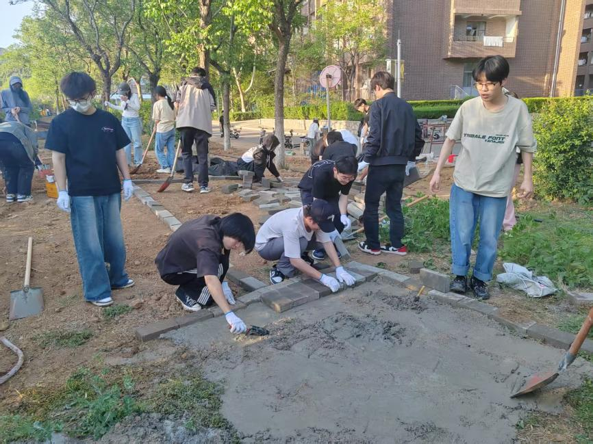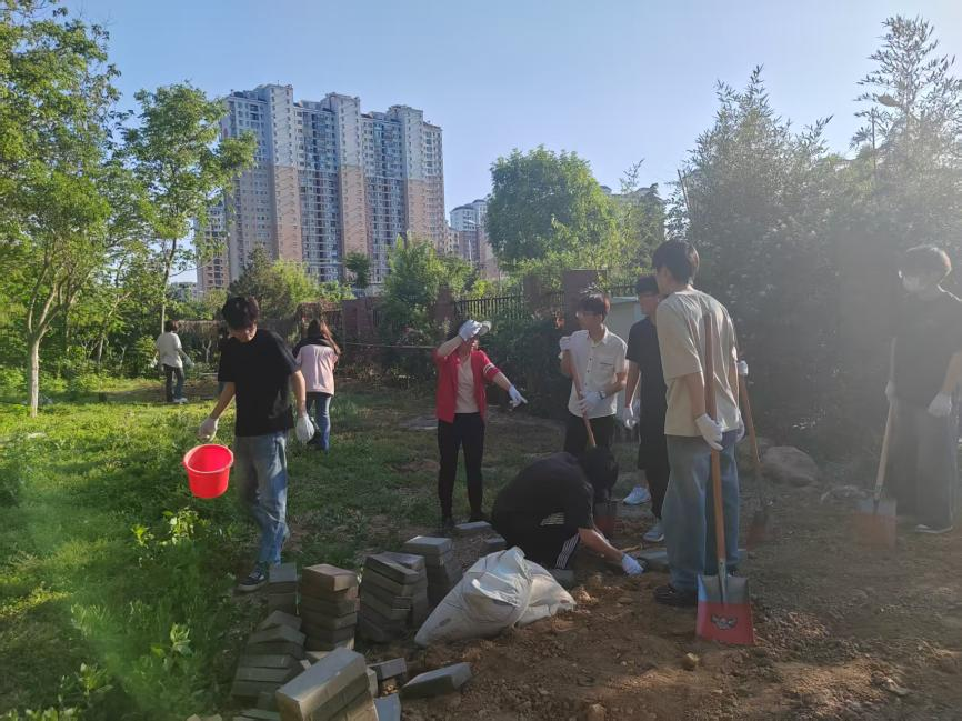 活动现场,同学们分工有序,齐心协力,不惧脏和累,干劲十足。有的在黄土上铺出蜿蜒的小径,有的蹲下身拾起石块,拔掉杂草,有的挥起锄头翻新着土地,有的细心地把小苗和种子种进土里,大家以积极的态度、饱满的热情实践劳动的理念,在汗雨挥洒中释放能量,愉悦身心。平整土地、种植花卉、铺设小路、播撒种子、灌溉浇水,经过数小时的忙碌,原本杂草丛生的区域变得井井有条,焕然一新,化作了一座充满生机与希望的花园。不仅为校园增添了一抹绿色,也成为了同学们的“心灵栖息地”。