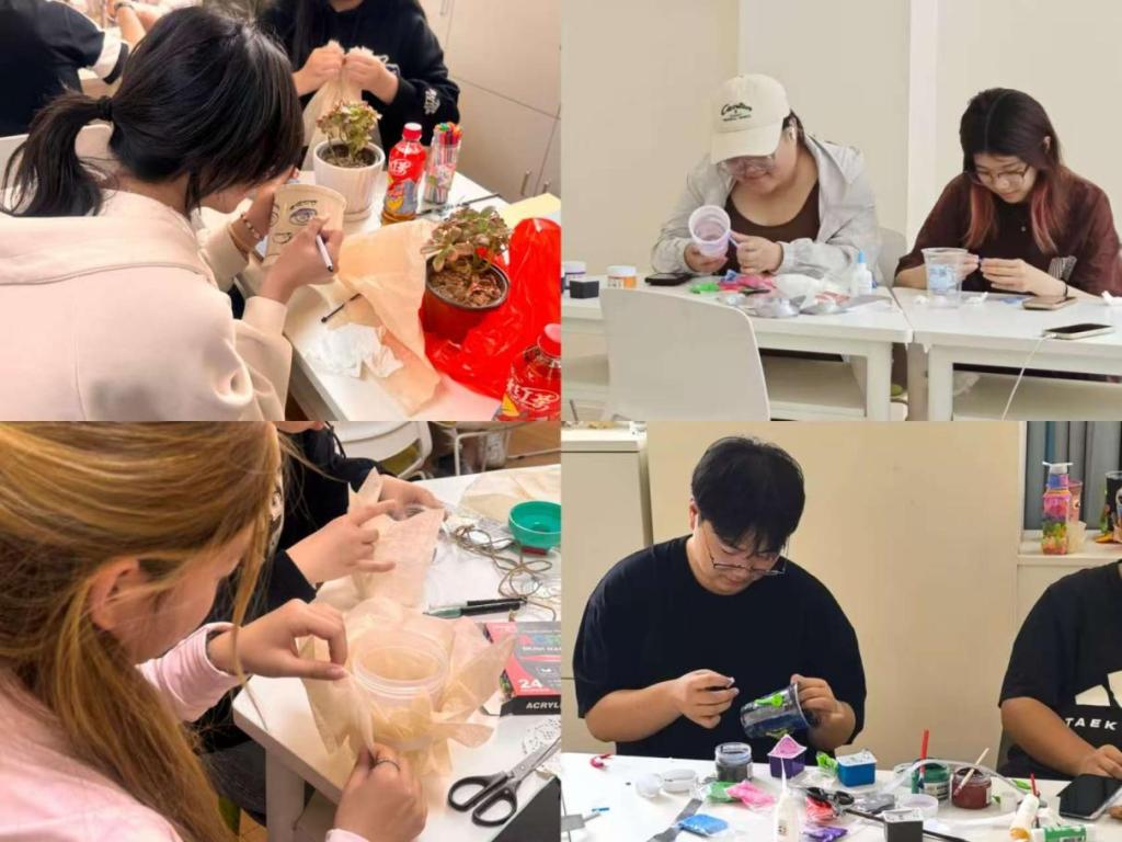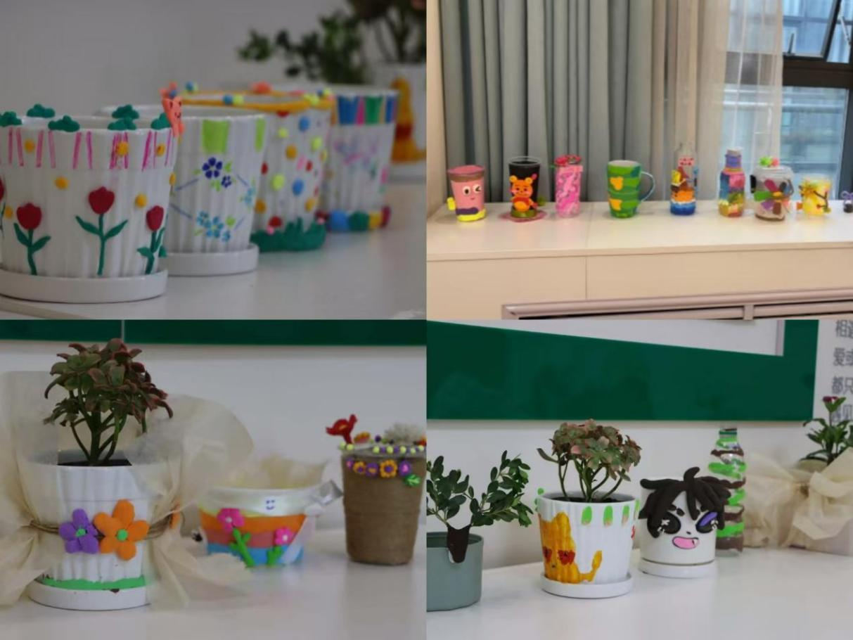 每期活动分为三个环节,第一个环节是暖场自我介绍,第二个环节是DIY创意手工制作,第三个环节是讨论分享。活动的主题是践行生态理念,进行创意设计,鼓励同学们利用身边的小物件进行设计与改造,制作独属于自己的花盆,去培育自己喜欢的小绿植或花卉,并观察成长过程。活动现场,同学们带来了玻璃瓶、陶瓷罐、奶茶杯、一次性纸杯等各式容器,利用中心提供的彩泥、画笔、卡纸、水粉、丝带、麻绳等材料,或独立创作,或合作设计,将平凡器皿变为独具匠心的艺术品。有的同学用麻绳编织出田园风格的花盆,有的则以彩绘赋予废旧塑料瓶新生,还有的做出了栩栩如生的小动物造型,展现了艺术与环保的完美结合。在活动分享环节,同学们都认为这个活动特别有意思,减压、快乐,像回到了童年时光。她们感言:“将一个随处可见的杯子改造成小花瓶让我很有成就感,期待看到自己的作品孕育出绿意,”“今天下午是一段久违的快乐时光,难得一次手机都没看,”“和同学合作完成套系作品,既有趣又有意义,我们想回去种两棵香水菠萝。”参与的学生脸上洋溢着笑意与满足,整个现场充满了欢声笑语。