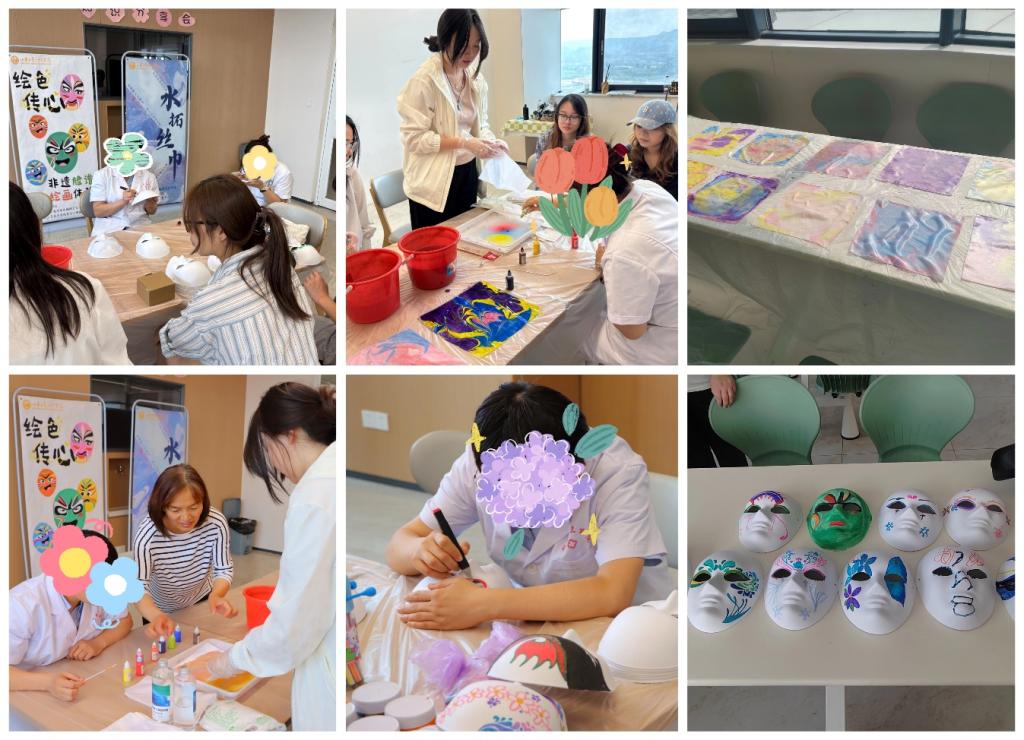 随后,同学们进入病区,为医生和患者开展水拓丝巾与情绪脸谱绘制艺术手工体验活动。他们耐心指导医患掌握水拓技法,进行色彩搭配,并拓染丝巾;对情绪脸谱感兴趣的医患通过丝巾再度拓印、绘画、写字等形式绘制面具脸谱。活动非常受欢迎,现场气氛温馨融洽,笑声连连,轻松愉悦。