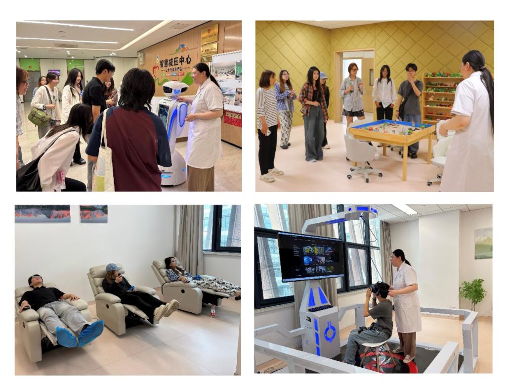 交流学习活动分为两个环节,同学们首先参观了济南市精神卫生中心智慧减压中心。在专业人员的引导下,参观了AI心理测评系统、零重力减压舱、VR心理调适系统、心理沙盘、感统训练室、光疗室等,通过智能设备测试心理状态,体验VR设备模拟场景放松,了解心理沙盘的治疗作用,与前沿智能减压设备来了一个亲密接触,对心理治疗和减压放松有了更深入的认识。